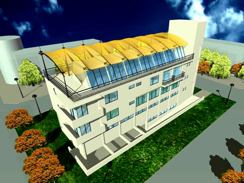 The building is situated on an empty lot, in a lively up and coming neighborhood, where the zoning regulations still permit the construction of mixed-use manufacturing with residential buildings. The client, who develops the lot for his own use insisted on an all-in-one structure. Printing plant and publishing house, occupy the basement and the ground floor. Above , there are offices for the publishing company and residential units for the client, and his family. The upper floor is treated like a penthouse under an enormous translucent covering, which is retractable and complies with the code regulations for setbacks, projec tions and temporary covers.