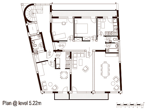 The building is situated in a typical old residential district. The lot has a peculiar shape a result from numerous acquisitions and re-regulations over the last hundred years. The zoning resolution calls for a continuous residential structure along Strakhil Street, with aligned cornices and equal setbacks from the property and building lines. The same client owns the adjacent building from the west side, that was also designed by my office in 1994. The existing building was a walk-up. The new one was to receive an elevator, which had to serve both buildings. This was a factor that determined the non-typical interior layout of the apartments of the new development. Both buildings are mixed-use condominiums with underground parking, offices on the ground floor and apartments above. Structure is cast-in-place concrete with brick walls and partitions. The area is 14,500 sf. Design was developed in 1996. Construction was completed in 1998.
