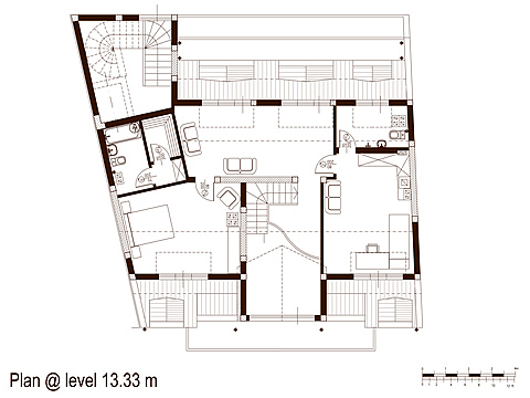 The building is situated in a typical old residential district. The lot has a peculiar shape a result from numerous acquisitions and re-regulations over the last hundred years. The zoning resolution calls for a continuous residential structure along Strakhil Street, with aligned cornices and equal setbacks from the property and building lines. The same client owns the adjacent building from the west side, that was also designed by my office in 1994. The existing building was a walk-up. The new one was to receive an elevator, which had to serve both buildings. This was a factor that determined the non-typical interior layout of the apartments of the new development. Both buildings are mixed-use condominiums with underground parking, offices on the ground floor and apartments above. Structure is cast-in-place concrete with brick walls and partitions. The area is 14,500 sf. Design was developed in 1996. Construction was completed in 1998.