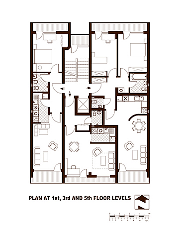 The building is located in a newly developed residential district in the outskirts of the city, away from  downtown and the central metropolitan area. The client is a development and construction company and all the apartments are built to sell as condominiums. All permitted zoning area has been used to the maximum. The interior layouts are simple, the variety of the apartment types is achieved through alternation at each floor thus having two kinds of typical floors with respectively 2 and 3 units. The alternation is also used as a characteristic element of the exterior of the building. The development has 9 stories, including the cellar. The first floor is used for private garages. There are 16 apartments above. Two of them are duplex penthouses. The total area is 24,000 sf. Design was developed in 1995. Construction was completed in 1997.