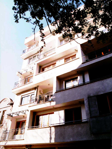 The building is located in a newly developed residential district in the outskirts of the city, away from downtown and the central metropolitan area. The client is a development and construction company and all the apartments are built to sell as condominiums. All permitted zoning area has been used to the maximum. The interior layouts are simple, the variety of the apartment types is achieved through alternation at each floor thus having two kinds of typical floors with respectively 2 and 3 units. The alternation is also used as a characteristic element of the exterior of the building. The development has 9 stories, including the cellar. The first floor is used for private garages. There are 16 apartments above. Two of them are duplex penthouses. The total area is 24,000 sf. Design was developed in 1995. Construction was completed in 1997.