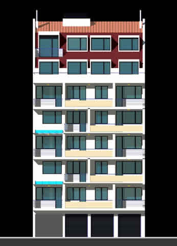 The building is located in a newly developed residential district in the outskirts of the city, away from  downtown and the central metropolitan area. The client is a development and construction company and all the apartments are built to sell as condominiums. All permitted zoning area has been used to the maximum. The interior layouts are simple, the variety of the apartment types is achieved through alternation at each floor thus having two kinds of typical floors with respectively 2 and 3 units. The alternation is also used as a characteristic element of the exterior of the building. The development has 9 stories, including the cellar. The first floor is used for private garages. There are 16 apartments above. Two of them are duplex penthouses. The total area is 24,000 sf. Design was developed in 1995. Construction was completed in 1997.